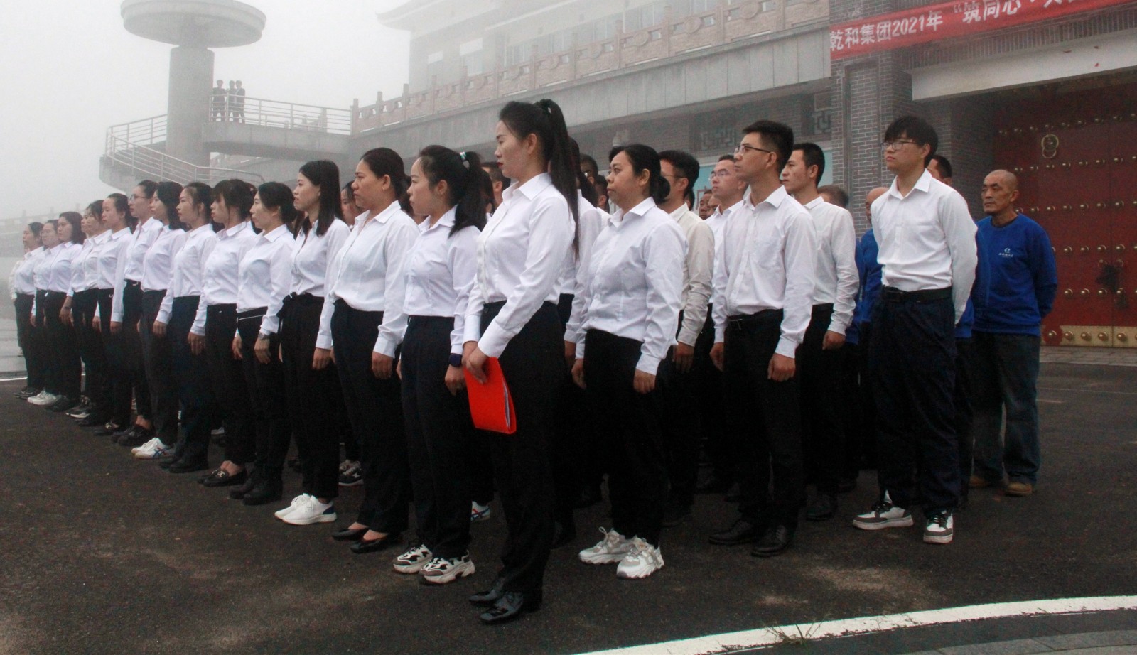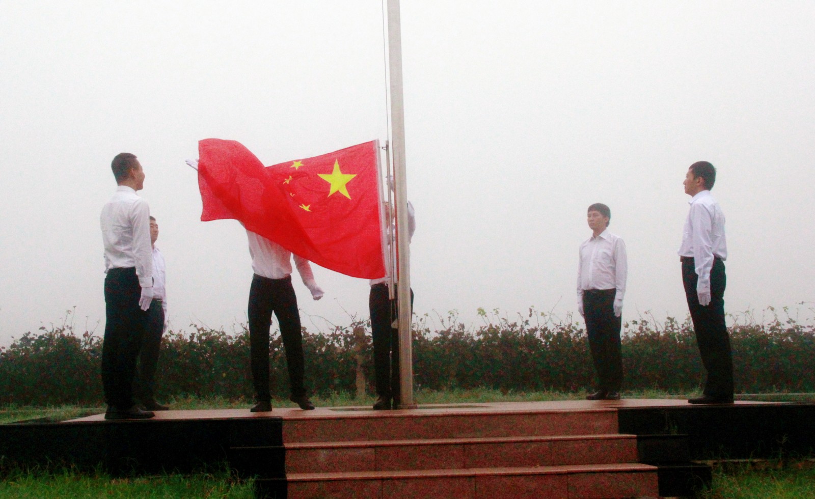 全體(tǐ)員(yuán)工(gōng)統一着裝、整齊列隊,面對國(guó)旗肅立,行注目禮,伴随着雄壯激昂的《義勇軍進行曲》,鮮豔的五星紅(hóng)旗冉冉升起。