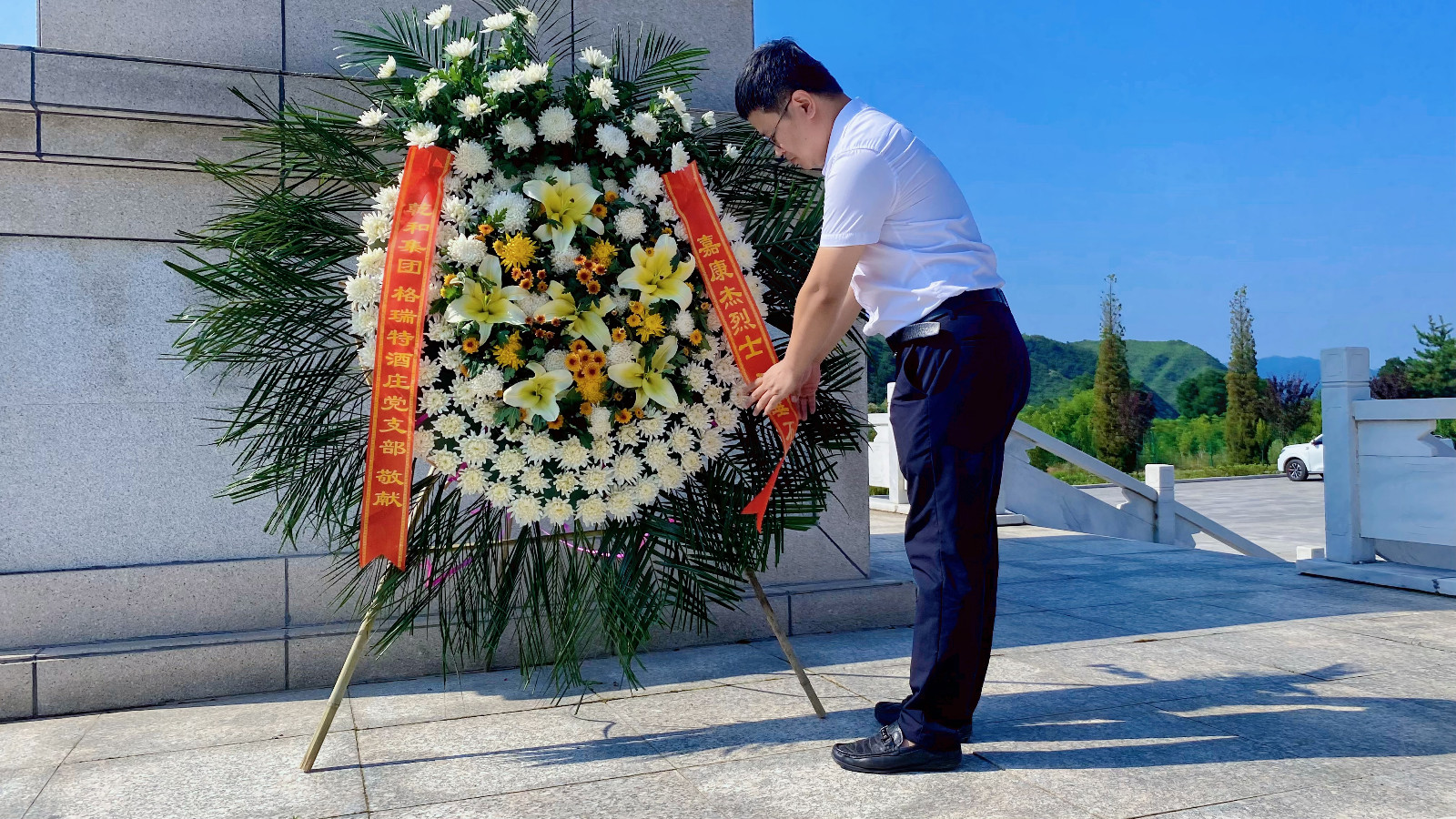 在韓家嶺紅(hóng)色革命紀念碑前,敬獻花籃并默哀,表達了對革命烈士深深地敬意,表達了對先烈們的哀思。